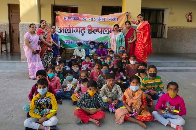 <h3>अलीगढ। अलीगढ़ हेल्पलाइन महिला शाखा द्वारा रामघाट रोड पर एक स्कूल में बच्चों को एकत्रित किया